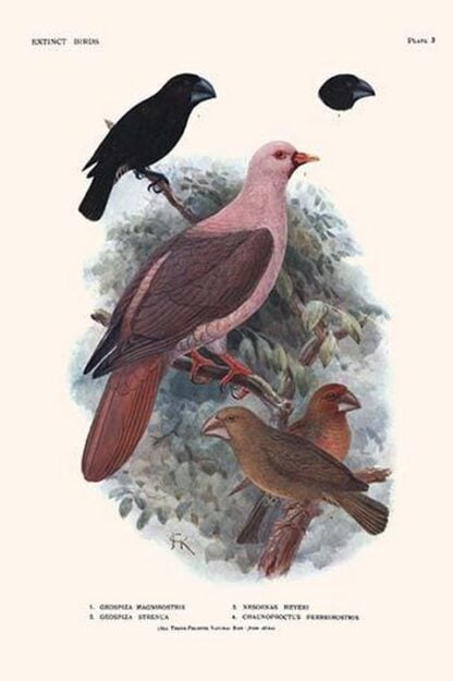 Geospiza Magnirostris, Geospiza Strenua, Nesoenas Myeri, Chaunoproctus Ferreiirostris by Lionel Walter Rothschild – Posters and prints on paper or canvas by standard digital or deluxe giclee printing.