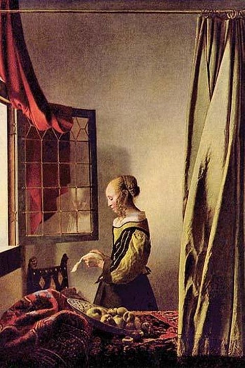 A girl reads a letter at the window with the wind furling the drapes1655/Holland