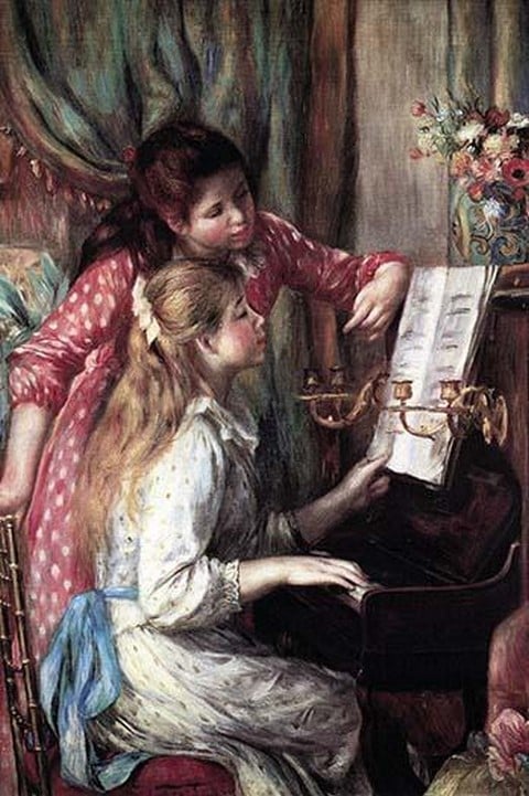 Two teenage girls examine the music score on the piano, one seated and one standing1875/France