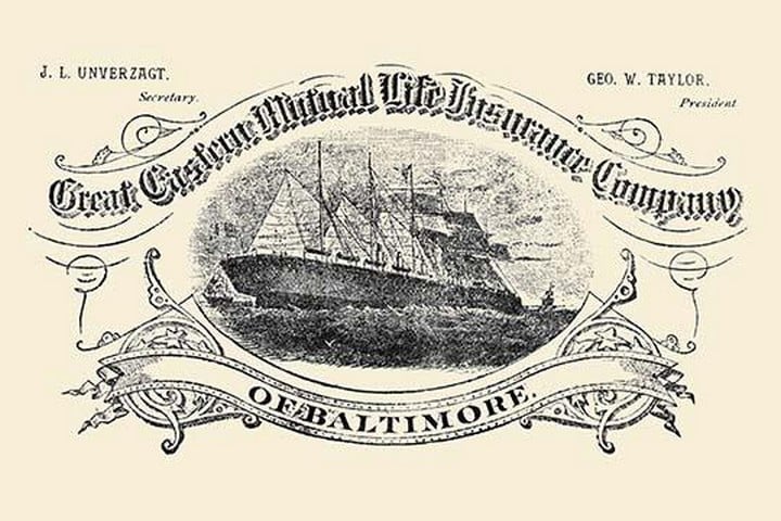 An insurance company’s newspaper advertisement featuring a large combination steam and sail ship on a vignette.Unknown Date/USA