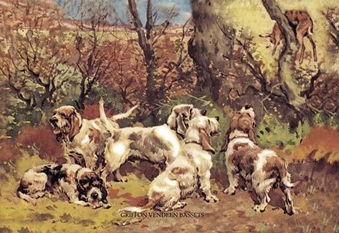 Five dogs look at their prey, a deer in a tree.1937/Britain
