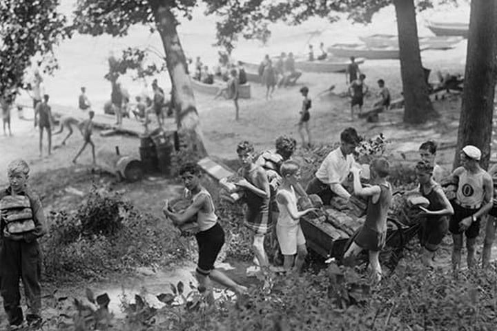 Group of Boys carry loaves of bread from wagons near beach front in woods.1923/USA