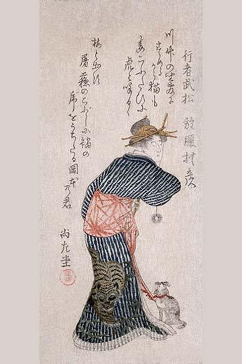 Print shows a woman, wearing kimono with a tiger design identifying her as Gyoja Busho, holding a toy on a string, playing with a cat. From the series: Mitate suikoden : Correspondence of Suikoden.1811/Japan