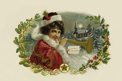 A winter Christmas scene with a snow covered church and a girl trumpeting in the New Year. Taken from a cigar box label.1898/USA