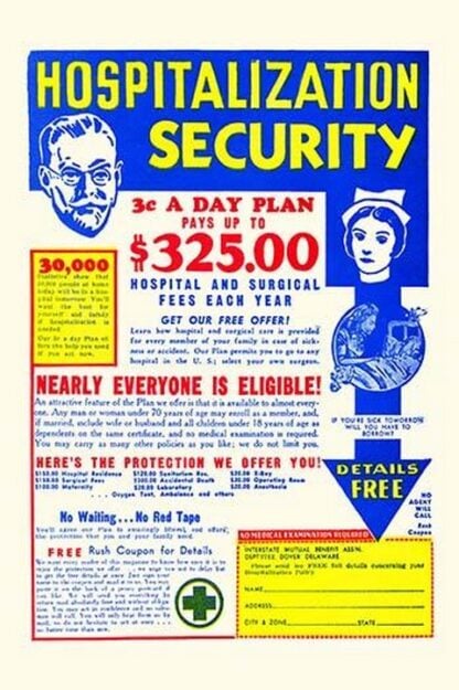 For only 3 cents a day one can purchase health insurance that will cover $325 a day in medical expenses. Taken from an advertisement on the back of a pulp magazine for insurance.1950/USA