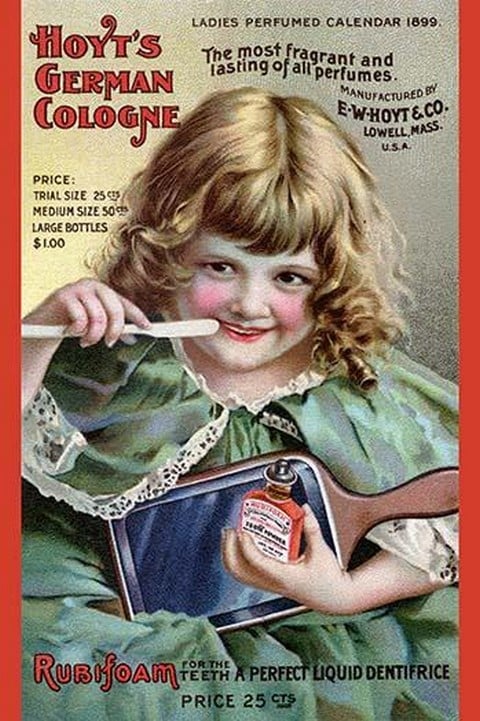 A Victorian trade card promoting two products, one a cologne and the other a ‘perfect liquid dentifrice’ for the teeth called Rubifoam. The little girl seems so happy to brush her teeth and show her smile.1899/USA