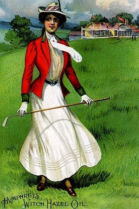 A Victorian trade card advertising a dermatological medicine. The card features a woman with a golf club out on the course.Unknown Date/USA