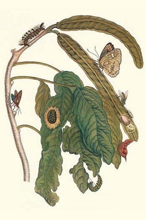 Ice Cream Bean Plant, Cloudless sulphur Butterfly and Caterpillar with moth on the stalk by Maria Sibylla Merian – Posters and prints on paper or canvas by standard digital or deluxe giclee printing.
