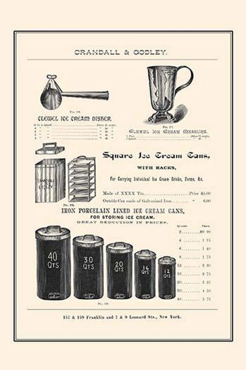 Page from the wholesale catalog of Crandall & Godley; manufacturers, importers, and jobber of baker’s, confections, and hotel supplies. Based in New York city.1887/USA