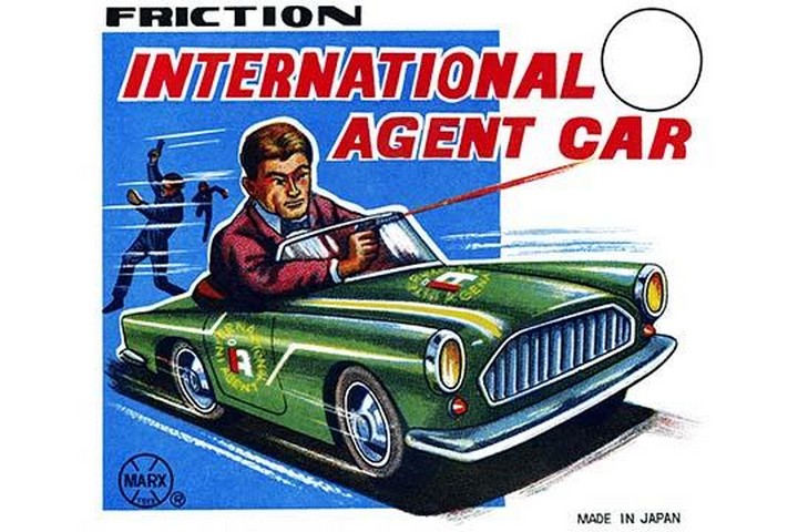 The original box art for a battery operated tin toy featuring a secret agent of ‘spy’1950/Japan