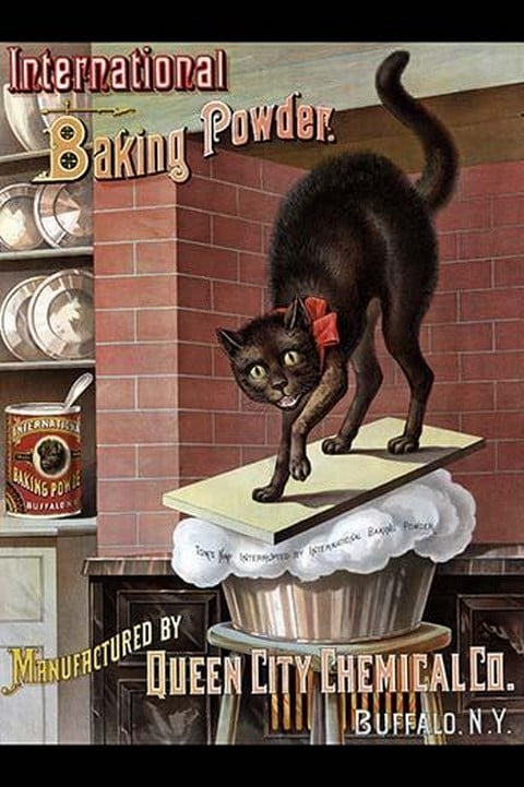 Advertisement for International brand baking powder, showing a cat awakened by bread rising. Manufactured by Queen City Chemical Co., Buffalo, N.Y.1885/USA