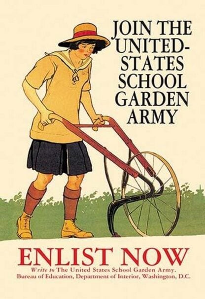 Children could work in gardens, too. A government program called the United States School Garden Army encouraged kids to feel that by gardening, they were fighting in France alongside the men in the trenches. Gardening, wrote President Wilson, “is just as real and patriotic an effort as the building of ships or the firing of cannon.” Designed by Edward Penfield (1866-1925) was prolific illustrator for many American publications like Harpers, Scribners, Colliers, and Saturday Evening Post.1918/USA