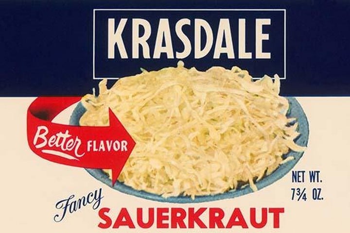An American can label for sauerkraut. Instructions say heat and serve and also it suggests it goes well with pig’s feet tidbits.Unknown Date/USA