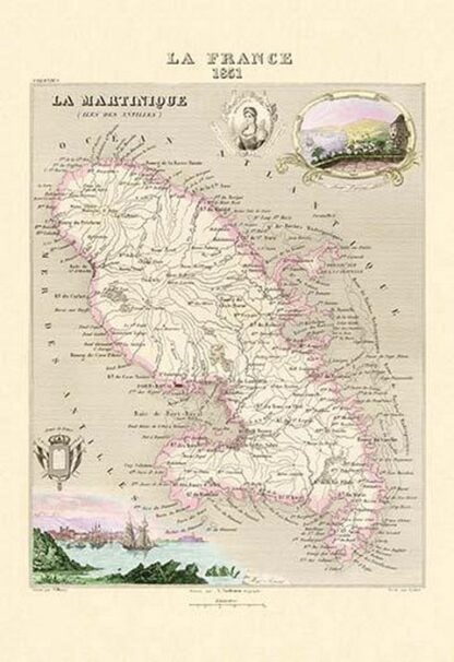Alexandre Vuillemin’s map “La Martinique (Iles des Antilles)” is a detailed and meticulously crafted representation of the Caribbean island of Martinique, part of the Lesser Antilles. Created in the 19th century, Vuillemin’s map exemplifies the precision and artistry characteristic of his cartographic work. Vuillemin, a renowned French cartographer, was known for his ability to combine scientific accuracy with aesthetic appeal, making his maps both functional and visually engaging. This particular map of Martinique showcases the island’s topography, settlements, and key geographical features with remarkable clarity. The use of color gradients effectively highlights the island’s varied terrain, from coastal plains to mountainous regions, providing viewers with an intuitive understanding of the landscape. Vuillemin also includes intricate details such as roads, rivers, and the layout of urban areas, reflecting the island’s infrastructure during that period. The surrounding decorative elements and embellishments, including floral motifs and maritime symbols, add a touch of elegance and context, situating Martinique within the broader Caribbean region. “La Martinique (Iles des Antilles)” not only serves as a valuable historical document but also as a piece of art that captures the essence of the island’s geography and Vuillemin’s cartographic expertise.