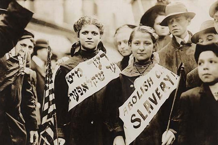 half-length portrait of two girls wearing banners with slogan ‘ABOLISH CHILD] SLAVERY!!’ in English and Yiddish, one carrying American flag; spectators stand nearby. Probably taken during May 1, 1909 labor parade in New York City.1909/Unknown Place