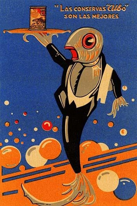 A postcard advertising canned salmon in the Spanish marketplace. The fish waiter holds a serving tray with the can and states in Spanish, ‘The Albo conserves are the best ones.’Unknown Date/Spain