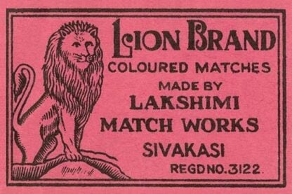 A brand of matches made by the Lakshimi match works in Sivakasi India trading under the name Lion brand.Unknown Date/India