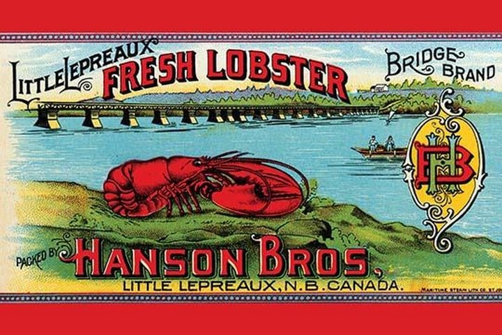 A can label for lobster packed in Canada by Hanson Brothers. The label features a bright red lobster on the shore near a long bridge spanning the water.Unknown Date/Canada