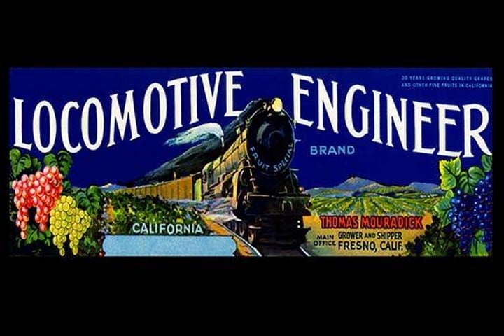 All sorts of fruit and vegetable crates needed labels. This label featuring a steam engine freight train is for California grapes. When the boxes were stacked for transport all over the United States the label was to identify one brand from another the growers and pickers developed fancy labels for the sides of the boxesUnknown Date/USA