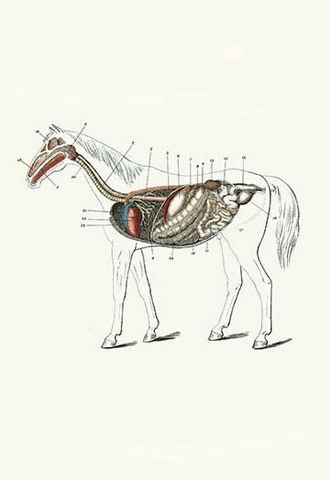 Originally published separately, these prints were combined into a book in 1873 and a section on veterinary medicine was added. Longitudinal section of a horse showing internal organs.1900/Britain