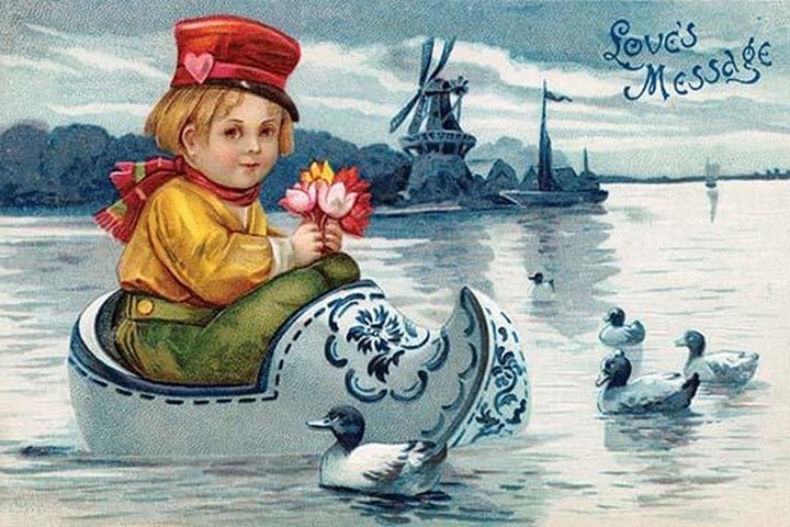 A vintage postcard featuring a little Dutch boy floating in a wood clog on a lake with ducks in front of a windmill and a sailboat. This Dutch themed valentine was intended to deliver ‘loves message.’Unknown Date/USA