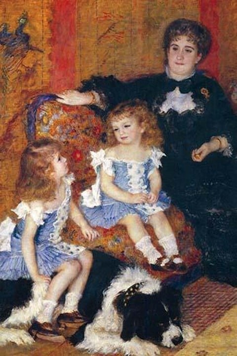 A Mother sits on a Sofa with her two young girls and their furry canine on the floor1875/France