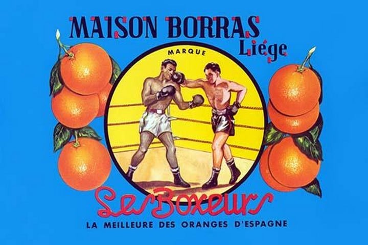 Spanish fruit crate label for oranges and featuring a pair of boxers fighting.Unknown Date/Spain