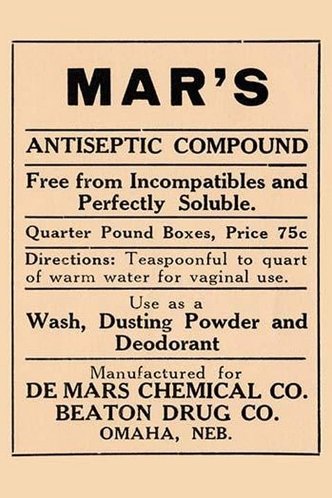 A 1920’s pharmacy bottle label. Many of these were quack cures and the main ingredient often was alcohol. This compound was for feminine hygiene.1920/USA