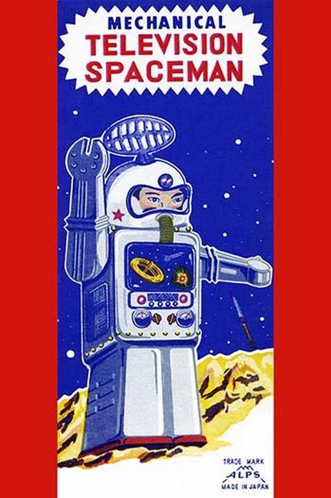 The 1950’s was a time of wonder and the universe was the focus of many young imaginations. Hollywood adopted science fiction and the toy industry followed closely. The Japanese manufactured toy robots for the children of America and designed great boxes to hold these vintage tin toys. This illustration art comes directly from these boxes.1950/Japan