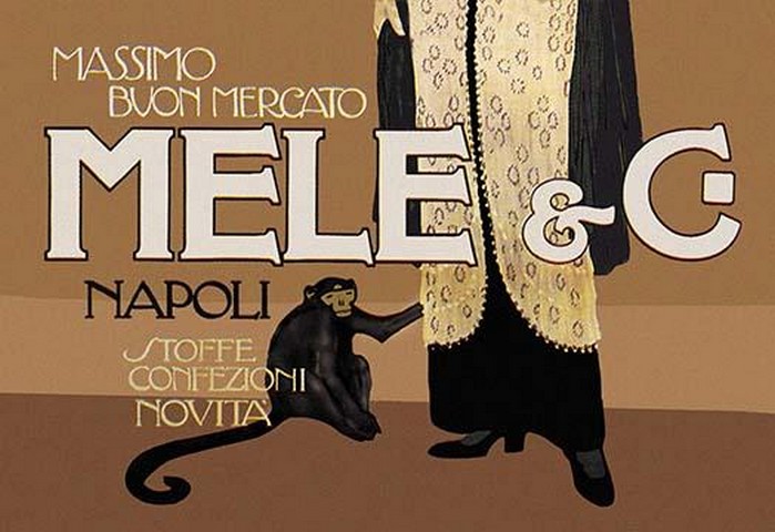One of half a dozen posters created for the Mele department store in Naples, this poster shows a playful monkey enjoying the clothes too. Designed by Aleardo Terzi (1870-1943).1911/Italy