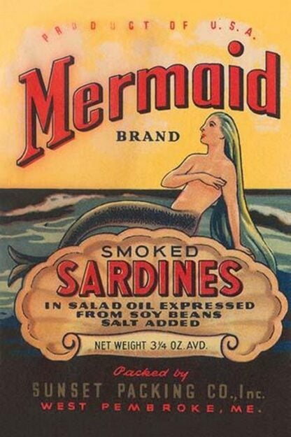 A can label for mermaid brand smoke sardines. Made in the USA, they were packed in salad oil expressed from soy beans, and had salt added. The Sunset Packing co of West Pembroke, Maine.1920/USA