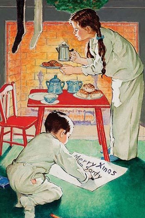 Two children prepare cookies and coffee next to the fireplace for Santa Claus. The boy writes a sign ‘Merry Xmas Santy.’Unknown Date/USA