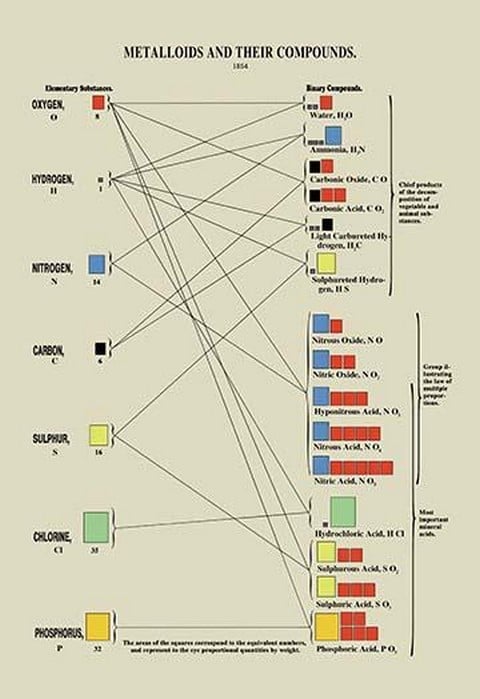 “Metalloids and Their Compounds” is a color plate from the Chemical Atlas; or, The Chemistry of Familiar Objects, authored by American scientific writer, editor, and lecturer Edward Livingston Youmans (1821-1887). This plate, published in 1856, illustrates the compounds of oxygen, hydrogen, nitrogen, carbon, sulfur, chlorine, and phosphorus. Youmans was a pioneer in popularizing science and founded Popular Science magazine. The book contains a total of 13 plates, each conveying scientific information through vivid illustrations.