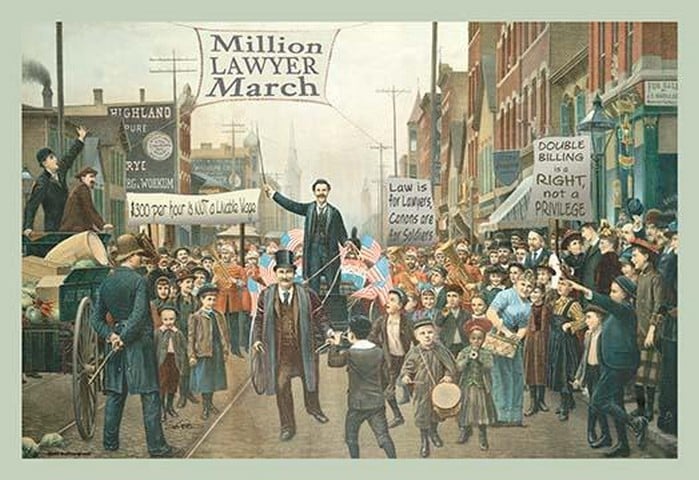 A turn of the century political parade is turned into a march for larger fees for lawyers. The street scene in New York shows large banners over the street.2000/USA