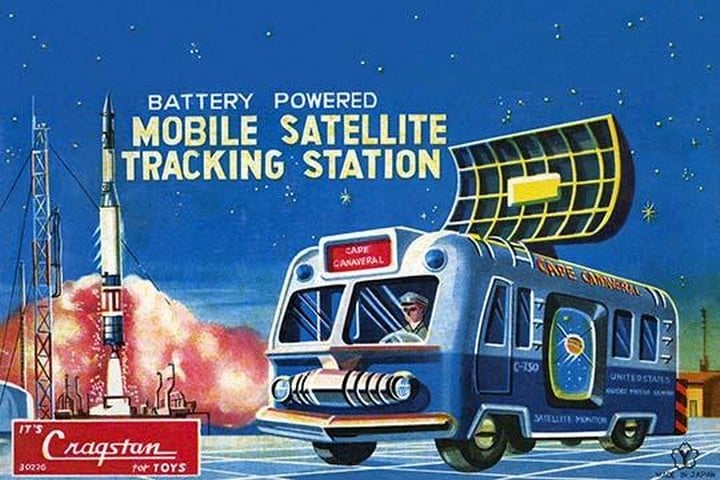 The 1950’s was a time of wonder and the universe was the focus of many young imaginations. Hollywood adopted science fiction and the toy industry followed closely. The Japanese manufactured toy robots for the children of America and designed great boxes to hold these vintage tin toys. This illustration art comes directly from these boxes.1950/Japan