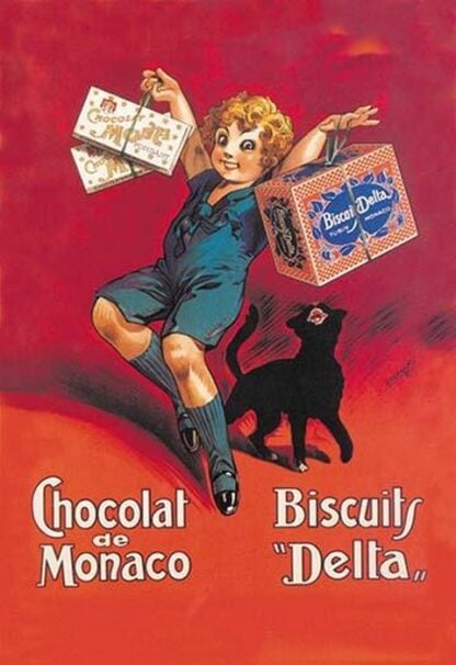 Chocolate and biscuit poster by DORFI (1881-1976). Featuring a little boy holding the treats above a very interested black cat.1930/France