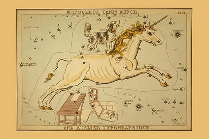 Astronomical chart showing a unicorn, a dog, and printing apparatus forming the constellations. Jehoshaphat Aspin, an American artist active in the 18th and 19th centuries, made significant contributions to both art and literature. One of his notable works is the “Familiar Treatise on Astronomy” (1825), which he authored. This book, published by Samuel Leigh in Britain, explains the general phenomena of celestial bodies through etchings, engravings, and hand coloring. Aspin’s illustrations provide insights into the cosmos, bridging scientific knowledge and artistic expression. Additionally, Aspin delved into children’s literature, geography, and history. His primary work, “Cosmorama: A View of the Costumes and Peculiarities of All Nations”, explored cultural and geographical connections across disparate peoples. This hand-colored engraved book, published by J. Harris in London around 1826, showcased costumes and customs from around the world. Aspin’s multidisciplinary approach left a lasting impact on both scientific and artistic realms.