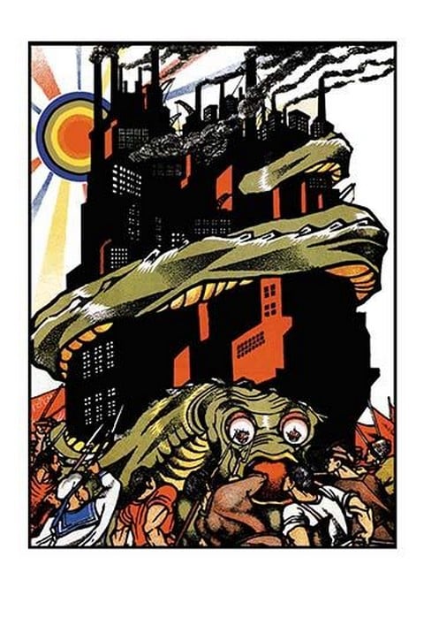 A giant worm like monster is being attacked by a mob of people as it destroys a large factory complex.Unknown Date/USSR