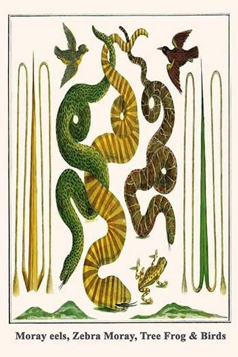 Moray Eels, Zebra Moray, Tree Frog & Birds by Albertus Seba – Posters and prints on paper or canvas by standard digital or deluxe giclee printing.
