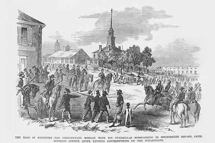 Frank Leslie was a prominent 19th-century American illustrator, publisher, and editor. He started as an illustrator for popular periodicals and established his own publishing company, “Frank Leslie’s Illustrated Newspaper,” which became one of the most successful and influential newspapers of its time. Leslie was also a pioneer in the use of photographs in journalism and established a photographic studio to create original images for his newspaper. He wrote several books and plays and was an important figure in the development of American media, shaping the way news was reported and disseminated. He died in 1880, leaving a lasting legacy.Morgan Guerillas Bivouac in Courthouse Square after levying contributions from the Kentucky CitizensUnknown Date/USA