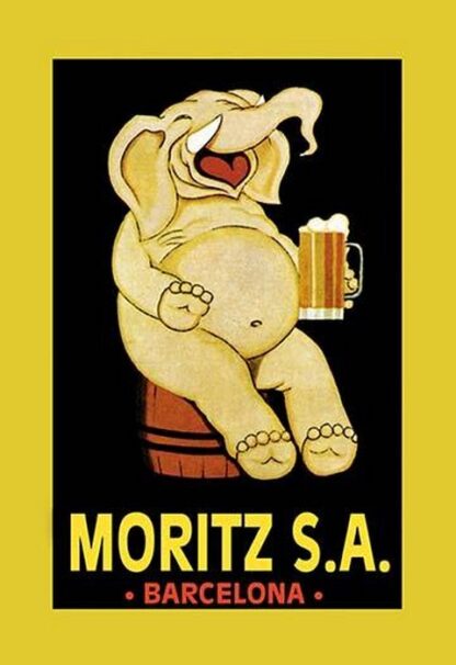 Beer drinking elephant sitting on a barrel is thoroughly enjoying his suds on this vintage advertising poster.1925/Spain