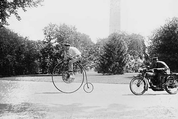 Motorcycle cop chases a Penny Farthing Velocipede down a DC Street with Washington Monument in background1921/USA
