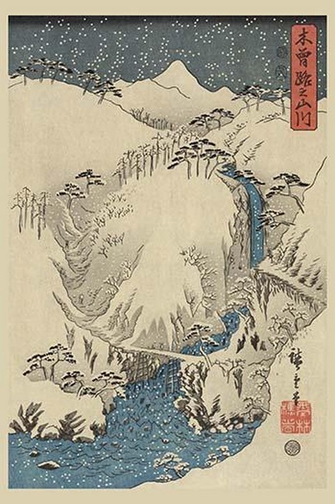 Print shows mountains and river along the Kiso Road during a winter snow storm. Part 3 of a triptych by Utagawa Hiroshige started in 18571857/Japan