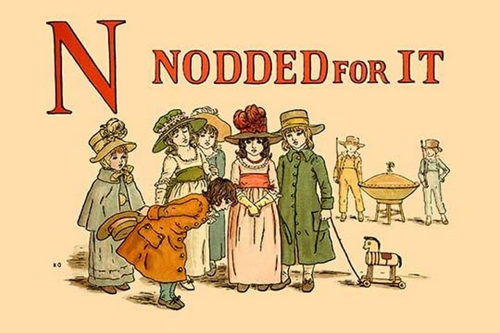 Taken from the book ‘A Apple Pie: An Old-Fashioned Alphabet Book’ published in London in 1886, this is a page illustrating an old nursery rhyme. The author was Kate Greenaway (Catherine Greenaway) (1846-1901) was an English children’s book illustrator and writer. She was very well respected as an artist. Her special talent was the ‘Kate Greenaway’ children, all of them little girls and boys too young to be put in trousers, according to the conventions of the time, were dressed in her own versions of late eighteenth century and Regency fashions: smock-frocks and skeleton suits for boys, high-waisted pinafores and dresses with mobcaps and straw bonnets for girls.1886/UK