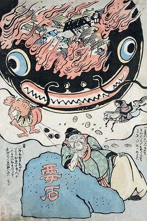 Namazu-e print. One of a series of Japanese prints produced after the great Ansei earthquake in Edo (Tokyo) show ‘earthquake catfish.’ These prints featured depictions of mythical giant catfish (namazu) who, according to popular legend, caused earthquakes by thrashing about in their underground lairs. Namazu are normally kept under control by the god Kashima using a large rock known as kaname-ishi. The Great Ansei Earthquake of 1855 is said to have occurred when Kashima went out of town and left Ebisu (god of fishing and commerce) in charge. In this print, the giant subterranean catfish unleashes destruction on the city while Ebisu sleeps on the job. Kashima rushes home on horseback while the city burns, and Raijin the thunder god defecates drums. Large gold coins fall from the sky, symbolizing the redistribution of wealth during the rebuilding phase.1855/Japan