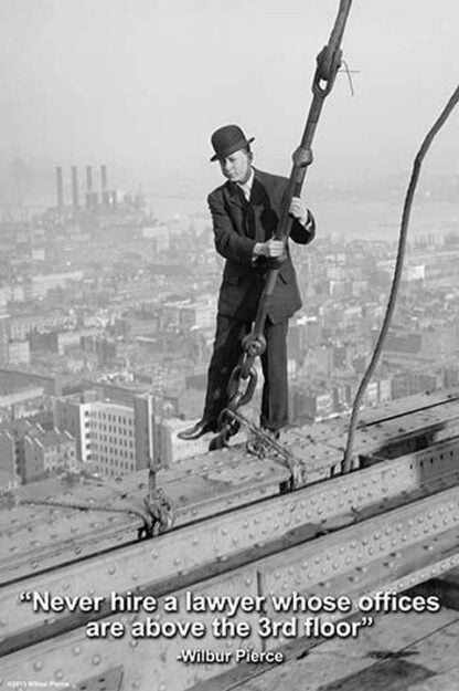 Vintage photograph with a quote, ‘Never hire a lawyer whose offices are above the 3rd floor.’Unknown Date/USA