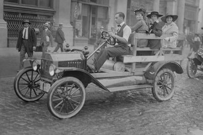 Employees of the New York Railways Company go out on strike; New York Car Strike has women transported to work in an open sided male driven vehicle1916/USA