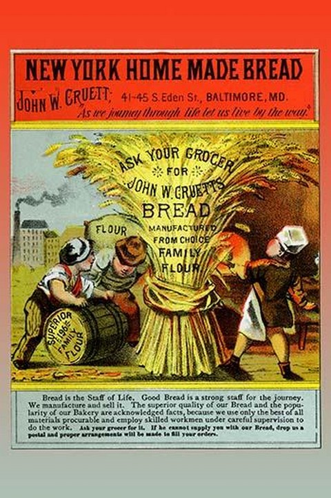 This color advertisement from the late 1800’s requested one to ‘Ask your grocer for John W. Cruetts Bread.’ The picture features all the stages from gathering the wheat to milling the flower and finally baking the bread.Unknown Date/USA