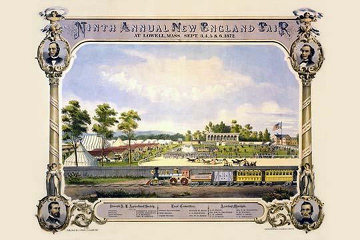 View of fairground, with horses racing, tents, and crowds, and railroad train in foreground, Lowell, Massachusetts.1872/Unknown Place