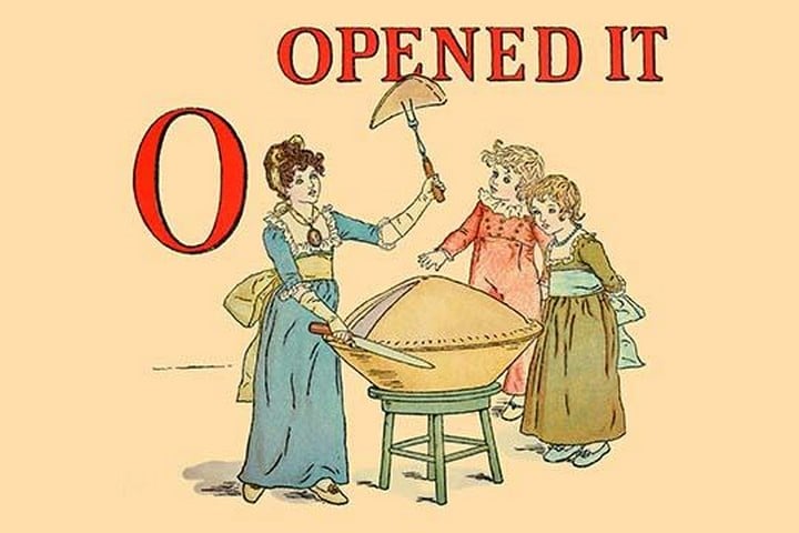 Taken from the book ‘A Apple Pie: An Old-Fashioned Alphabet Book’ published in London in 1886, this is a page illustrating an old nursery rhyme. The author was Kate Greenaway (Catherine Greenaway) (1846-1901) was an English children’s book illustrator and writer. She was very well respected as an artist. Her special talent was the ‘Kate Greenaway’ children, all of them little girls and boys too young to be put in trousers, according to the conventions of the time, were dressed in her own versions of late eighteenth century and Regency fashions: smock-frocks and skeleton suits for boys, high-waisted pinafores and dresses with mobcaps and straw bonnets for girls.1886/UK